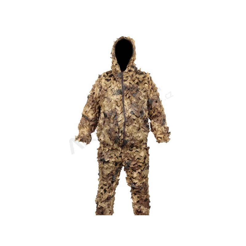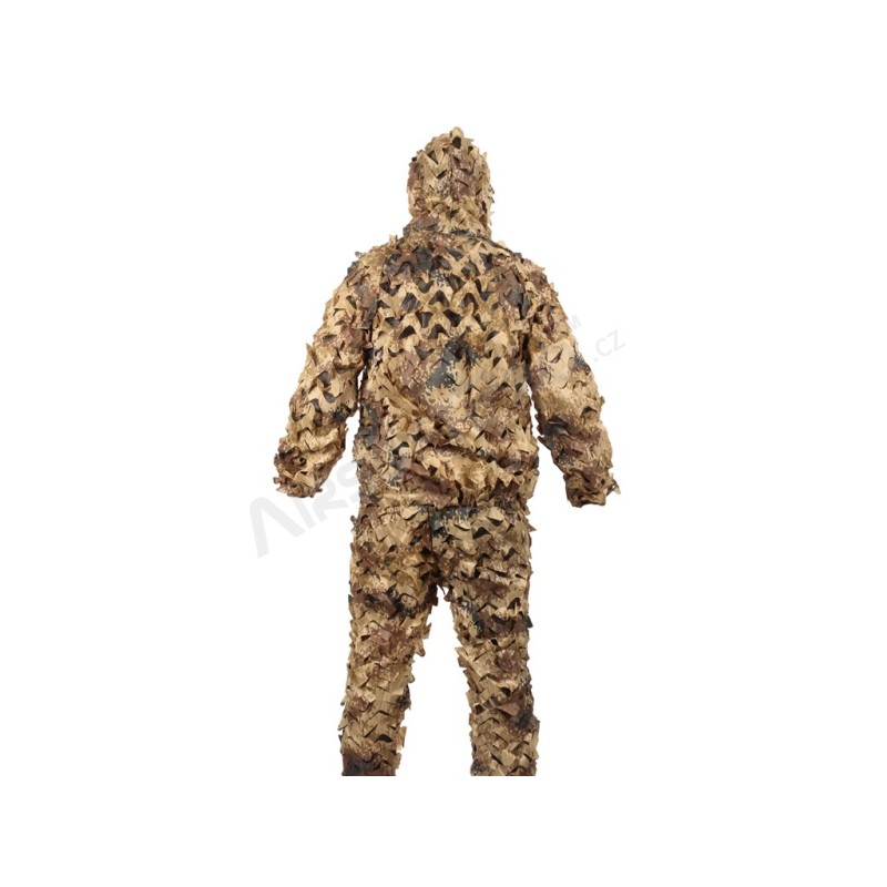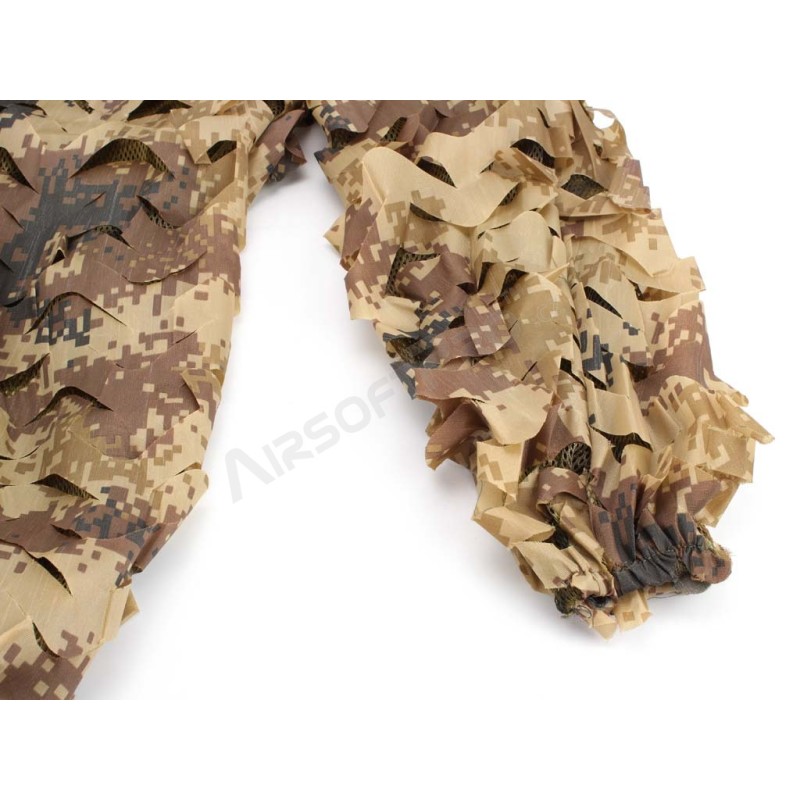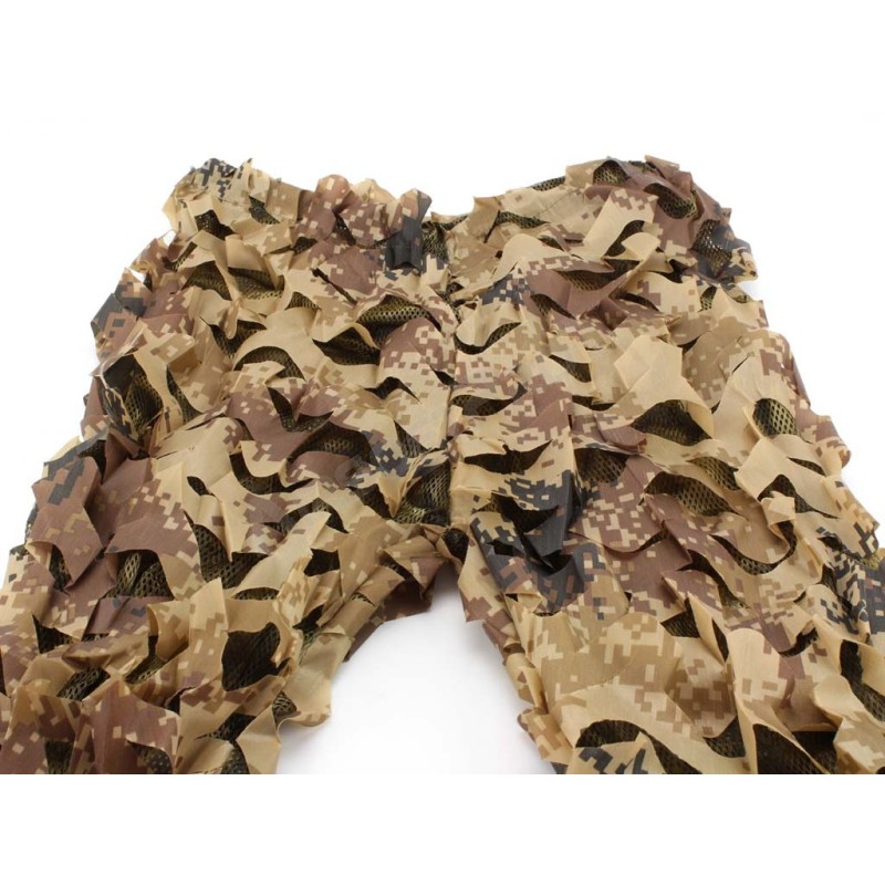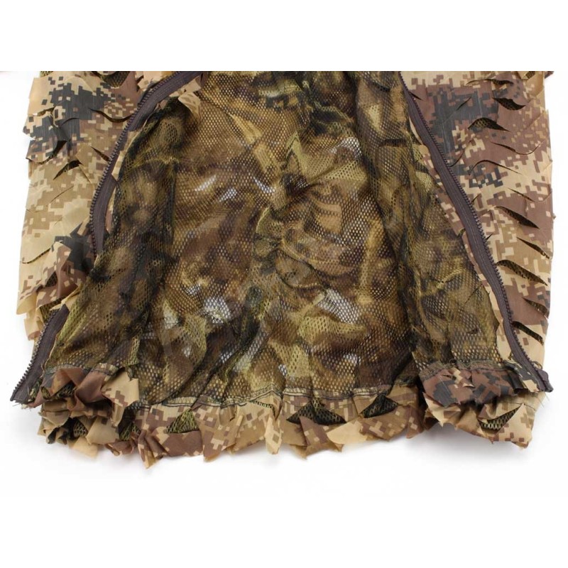 A diferencia de los trajes ghillie normales hechos de cuerdas de cáñamo, etc., este traje tiene una tela de poliéster cortada a máquina en la superficie que crea un patrón 3D. Combinado con el patrón de camuflaje, proporciona una muy buena cobertura. Además, gracias a que la base de la blusa y el pantalón es de malla, el traje es ligero (425 g) y transpirable, lo que lo hace significativamente más cómodo en comparación con los trajes ghillie convencionales.