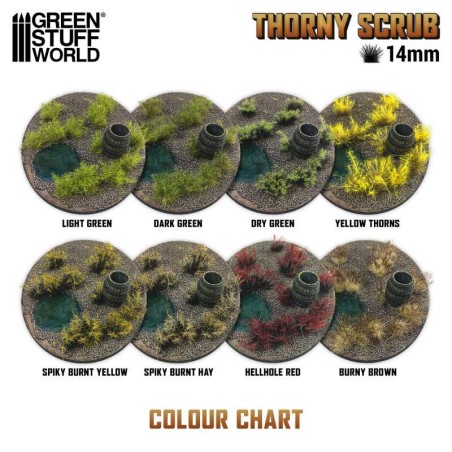Este producto consiste en arbustos “espinosos” (tufts puntiagudos) de modelismo con una altura de 14 mm, en un tono verde seco. Están diseñados para escenografía y peanas de miniaturas, especialmente en entornos de fantasía o ciencia ficción, donde quieras simular matorrales rígidos, vegetación áspera o desértica. Gracias a su base autoadhesiva, se colocan con facilidad; en casos de superficies irregulares, puedes reforzar la fijación aplicando una gota de pegamento.
