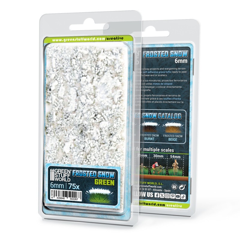 Este producto ofrece pequeños arbustos artificiales con efecto de nieve, con una altura de 6 mm y un tono verde. Están diseñados para usarse en escenografía, maquetas o bases de miniaturas, aportando un toque invernal realista. Gracias a su adhesivo integrado, se pueden colocar fácilmente sin necesidad de pegamentos complicados, aunque para un fijado más duradero, se puede recurrir a una gota de cola de modelismo.