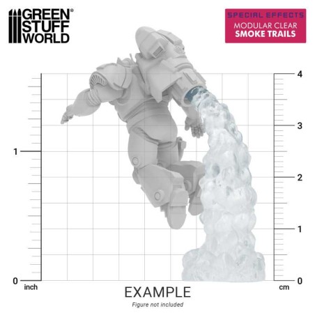 Se trata de un set de efectos de humo en resina transparente, diseñado para recrear el chorro visual que generan los jetpacks (propulsores de salto) en miniaturas de wargames. Su función es aportar realismo a figuras que usan estos sistemas de propulsión, simulando la estela de humo que dejarían al saltar o volar.