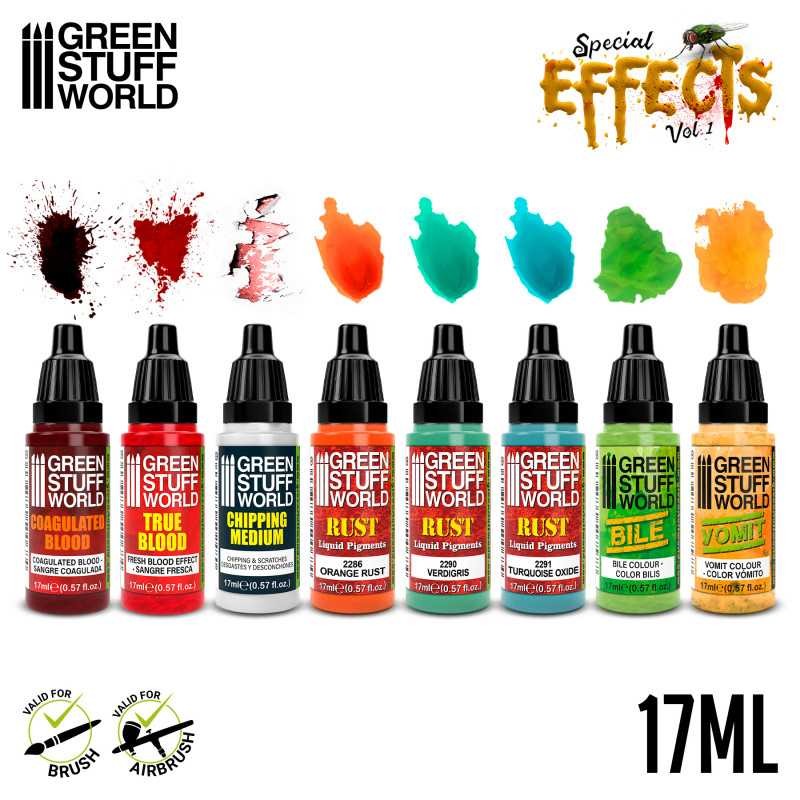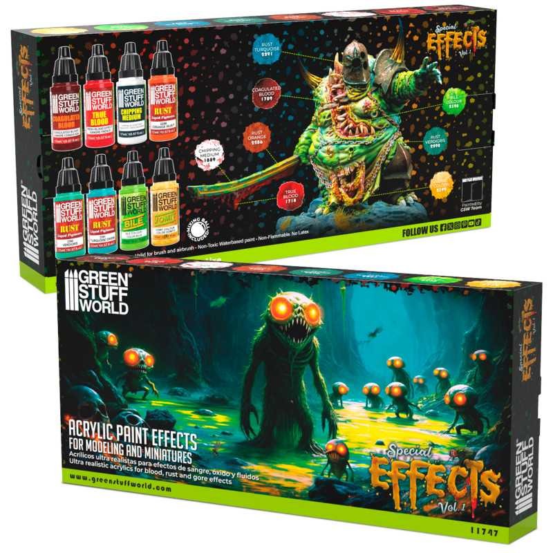 Este es un kit de pinturas acrílicas creado para generar efectos visuales especiales en tus proyectos de modelismo, dioramas y figuras. Cada color tiene un propósito concreto para imitar detalles realistas como sangre, oxidación, desgaste o fluidos, ayudándote a añadir profundidad y dramatismo a tus creaciones con facilidad. El set es adecuado tanto para aplicación con pincel como con aerógrafo, y ofrece un acabado que hace que tus miniaturas destaquen por su nivel de detalle.