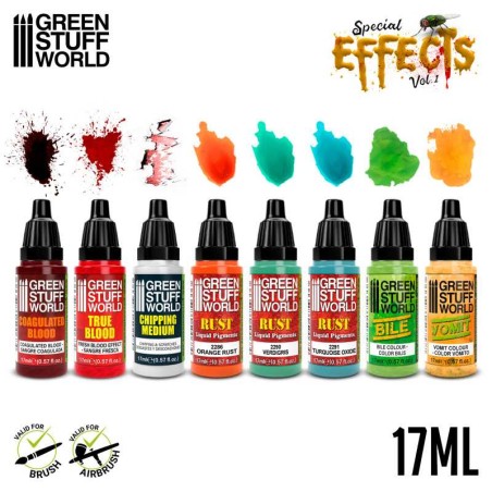 Colección de 8 pinturas acrílicas para efectos especiales, cada una con un uso particular para simular distintos fenómenos visuales.