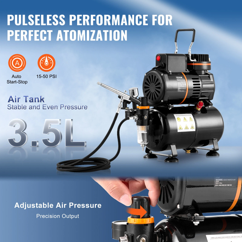 Este es un completo sistema de aerógrafo con compresor y tanque de aire, diseñado para permitirte aplicar pintura de forma fina y precisa en múltiples superficies. Es perfecto para trabajos de arte, hobby, maquillaje, decoración de pasteles, modelismo, uñas-art y más, ofreciendo control ajustable del flujo de aire para tareas tanto delicadas como amplias.