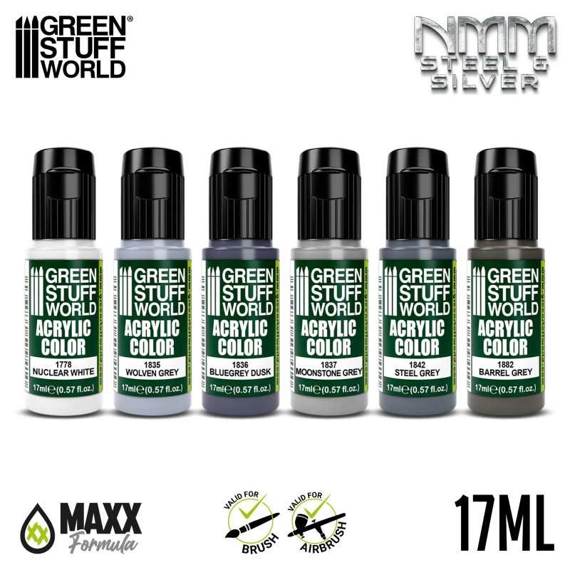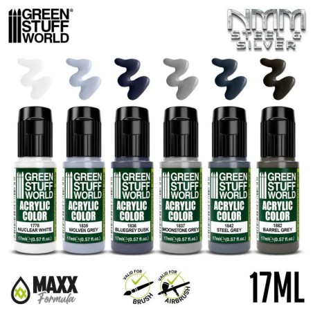 Este set de pintura es una selección de colores acrílicos formulados para reproducir acabados tipo “Non-Metallic Metal” (metal no metálico) en tonos que evocan plata y acero envejecido o pulido. Está diseñado especialmente para modelistas y pintores de miniaturas que buscan resultados de aspecto profesional, con una gama equilibrada de tonalidades que facilitan sombrear, iluminar y obtener un efecto metálico realista sin usar pinturas metálicas.